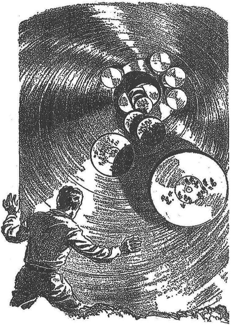 Ослеплённый, остолбеневший, я склонился к краю гигантской шахты, заглянул внутрь. Громкое гудение внизу прекратилось, и я мог различить далеко внизу чёрный блестящий диск, но цилиндра на нём уже не было. Там были крупные предметы возле него, были другие большие цилиндры, но тот, в котором были черепахолюди и Хауленд, исчез.