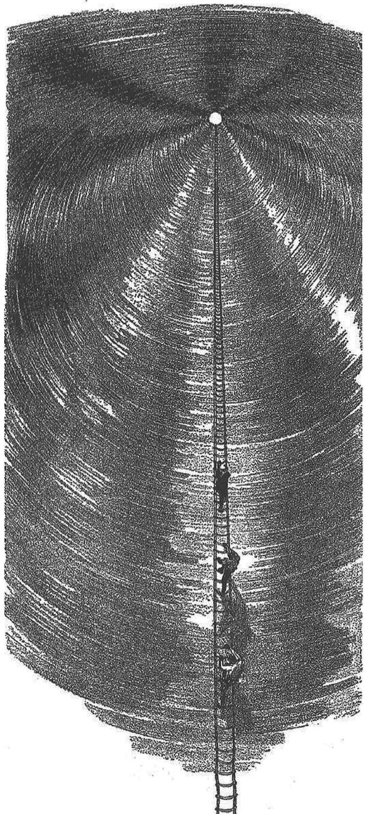 Автоматическое, бессознательное и безостановочное движение рук и ног, что упорно несли меня глубже в сумрак громадной шахты. К этому времени полумрак вокруг нас сгустился до темноты, и ко времени, когда, по моим предположениям, мы спустились на две тысячи футов, мы продвигались в кромешной тьме. Зев огромной шахты был теперь не больше маленького кружка неясного света далеко над нами. Продолжая нащупывать дорогу, мы ползли вниз по лестнице, пока от Карсона, что находился ниже меня, не донёсся внезапный возглас, который заставил нас с Трентом остановиться.