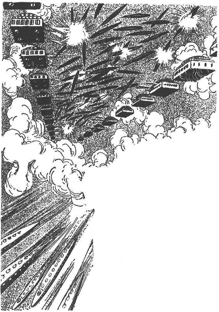 Зависнув в облаках, парализованный приступом страха, я неожиданно осознал, что это конец. Корабли противника приближались к нам со всех сторон. Бежать было некуда, все пути к отступлению были отрезаны. Один миг отделял нас от гибели в пламени рвущихся термоснарядов. Один миг!