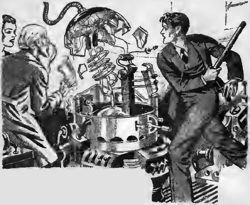 Он подвёл меня к столу в углу лаборатории. Рядом со столом возвышался большой цилиндрический предмет, накрытый брезентовым чехлом, но моё внимание привлёк механизм на столе, на который указывал учёный. Будучи страховым агентом, я не мог понять, что это за штука. Она выглядела как сложное электрическое устройство, защищённое никелевым кожухом, с медной спиралью, обвивающей цилиндрический кожух снаружи.
