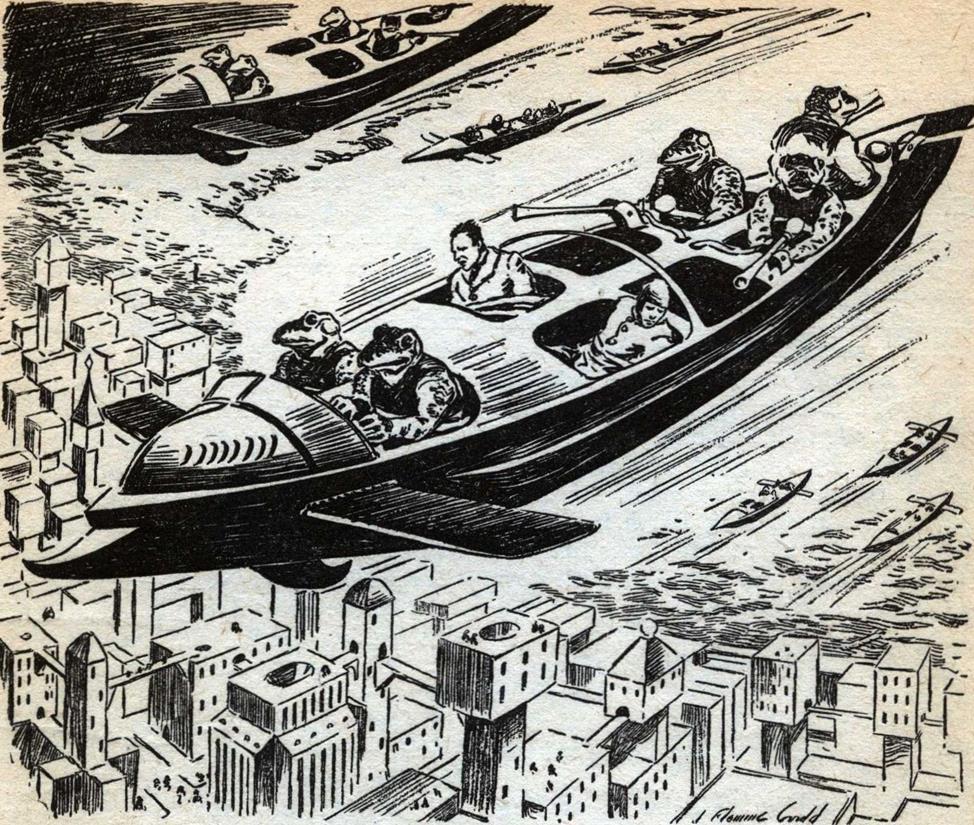 Город жаболюдей! Их лодки поднимались всё выше, и Норман с Хакеттом смогли его отлично рассмотреть. На квадратные мили под ними раскинулись чёрные здания, часто огромных размеров, разных очертаний, но все они были квадратными или прямоугольными. Между ними двигались бесчисленные орды жаб, заполняя улицы и площади, а над крышами роились тучи летающих лодок. В центре города, на большом, круглом, чистом пространстве, находился широкий, круглый, зеленый бассейн – отверстие того самого подводного тоннеля, через который они сюда попали.