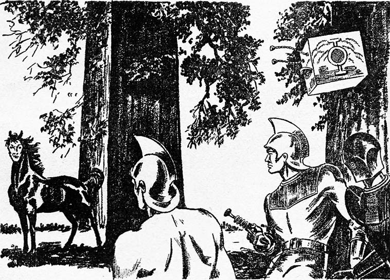 Капитан Фьючер смело направился к джунглям, подняв руку в извечном дружеском жесте. Остальные напряжённо наблюдали за происходящим.
