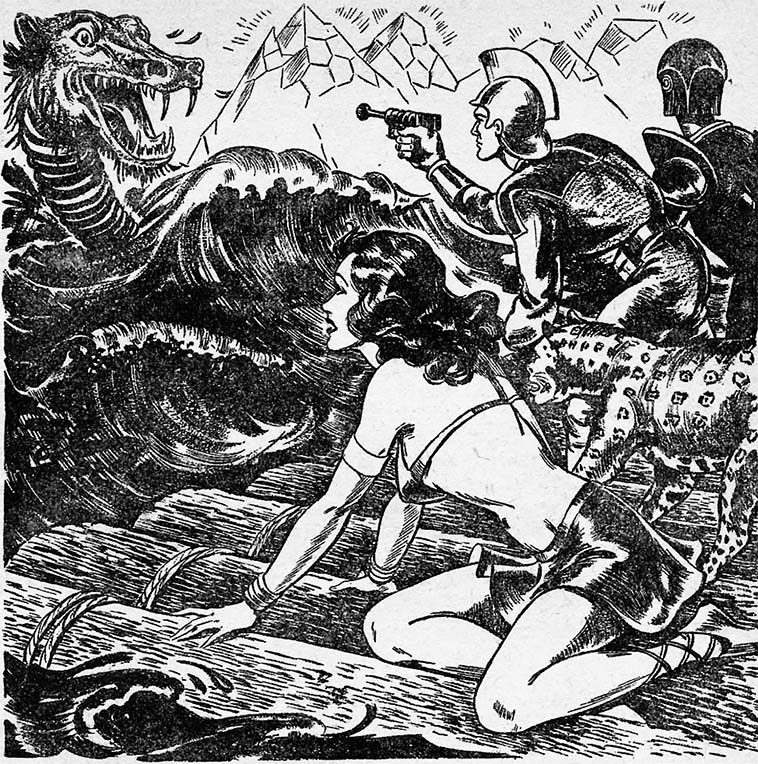 Возле покрытой лишайником стены зиял свежевырытый раскоп. Рядом с ним возвышалась огромная, невероятная фигура – массивный, человекоподобный металлический робот ростом около семи футов. Его фотоэлектрические глаза ярко сверкнули, когда он заметил приближающихся людей, и его механическая глотка вновь издала тот гулкий крик.