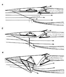 Описанные выше способы создания скачков уплотнения различаются между собой местом образования скачков относительно плоскости входа в воздухозаборник. Общей чертой их является многоступенчатость процесса торможения потока, благодаря чему обеспечиваются максимальное использование динамического сжатия, минимальные потери и равномерное распределение скорости.