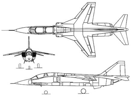 Описание самолета. Самолет Т-2 представляет собой двухместный, двух двигательный высоко– план с крылом переменной стреловидности по передней кромке (68° в корневых и 42° в остальных частях), отрицательным углом поперечного V, равным 9°, и геометрическим уступом передней кромки. Самолет предназначен для полетов с большими скоростями, поэтому для поперечного управления используются только двухсекционные интерцепторы. Отказ от элеронов позволил разместить закрылки почти по всему размаху. Благодаря этому комбинация интерцепторов, предкрылков и закрылков (предкрылки и закрылки выдвигаются одновременно, что существенно увеличивает подъемную силу крыла) обеспечивает самолету хорошие взлетно– посадочные характеристики. Фюзеляж выполнен в соответствии с правилом площадей, а его нижняя поверхность отвечает требованиям, предъявляемым к так называемым несущим фюзеляжам. Двухместная кабина экипажа (с местами «тандем») имеет секционированный, отдельный для каждого члена экипажа фонарь, открываемый вверх-назад. Для обеспечения монтажа и демонтажа двигателей задняя часть фюзеляжа выполнена разъемной. В его нижней части расположены два подфюзеляжных киля, способствующие увеличению путевой устойчивости самолета. На нижней поверхности центральной части фюзеляжа имеются два тормозных щитка. Управляемый стабилизатор установлен с отрицательным углом поперечного V, равным 15°. Классическое вертикальное оперение большой площади снабжено рулем направления. Трехстоечное шасси крепится к фюзеляжу и оснащено одинарными колесами с такими же пневматиками, как и у самолета F-104J (с давлением 1,22 МПа на главных стойках). Главные стойки после поворота на 90° убираются вперед, в фюзеляж, а передняя стойка – назад.