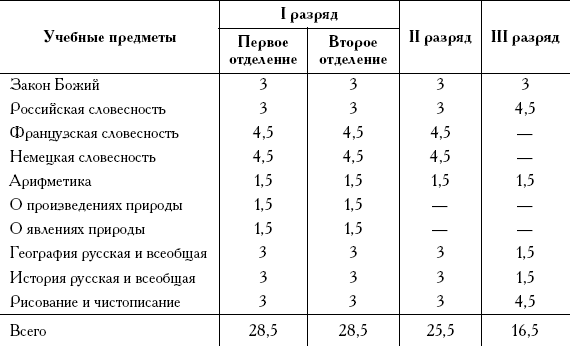 Как видим, абстрактная «качественная» типология женских учебных заведений, которую предложил министр народного просвещения С. С. Уваров в 1834 г. применительно к частным женским пансионам и школам – «отличные, хорошие и посредственные», спустя десять лет в Мариинском ведомстве была заменена конкретной и жесткой классификацией их по сословному принципу и материальному положению воспитанниц. Этим было доведено до строгого логического конца дело сословного различения женских школ, начатое еще императрицей Марией Федоровной. Импульсивно создаваемая ею своеобразная сословная россыпь женских учебных заведений теперь четко выстраивалась в сословные шеренги и колонны – разряды. При этом в каждом разряде устанавливались, как уже отмечалось, свой учебный курс, свои программы, своя таблица учебных часов (табл. 2).