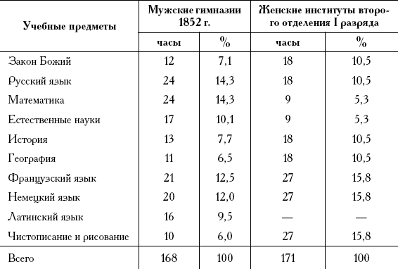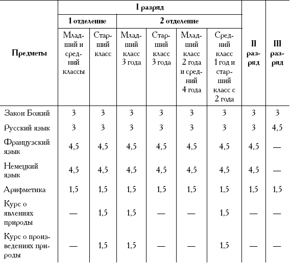 Ведущими предметами учебного курса в женских институтах были языки – 42% учебного времени. При этом на русский язык и словесность отводилось в три раза меньше времени, чем на иностранные. На изучение арифметики, как и естественных наук, было отпущено в два раза меньше времени, чем на каждый из остальных предметов, включая Закон Божий. Последний в женских средних учебных заведениях, в отличие от мужских, занимал равное место со всеми основными учебными предметами: 3 часа в неделю, или 10,5% учебного времени, в учебных заведениях I разряда, 11,8% – в заведениях II разряда и 20% – в заведениях III разряда. Здесь по числу учебных часов только рисование равнялось с Законом Божьим, а русский язык превосходил его в полтора раза. Напротив, на каждый из остальных учебных предметов отводилось в полтора раза меньше времени, чем на Закон Божий.