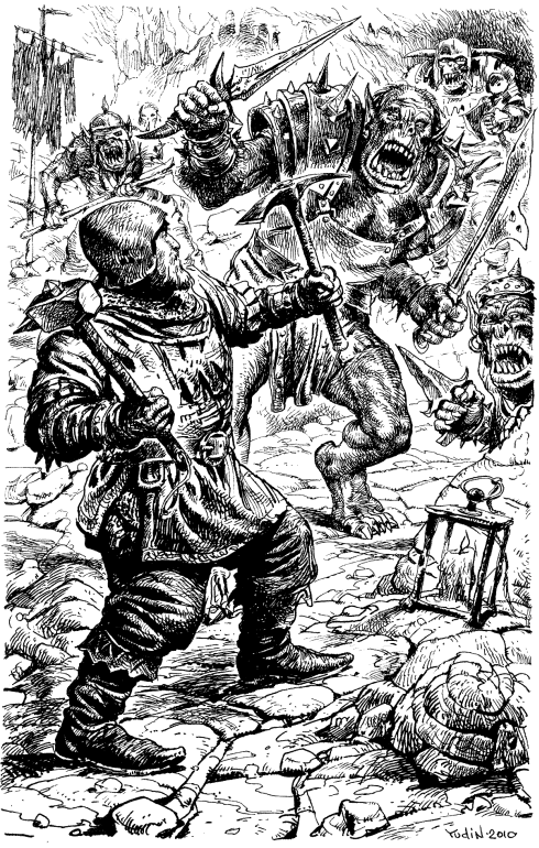 Еще один вздох горы. Гном, наклонившийся вперед, освещаемый лишь крохотным огоньком свечи за его спиной, выставивший вперед кирку и молот, наедине с темнотой подземелий.