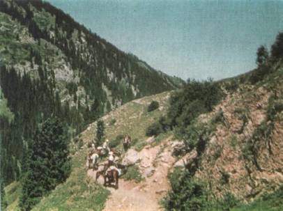 Караван экспедиции, поднимается по долине реки Арасан в Тянь-Шане