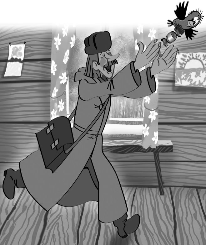 Шарик рассвирепел и давай почтальона кусать за валенки. Еле-еле Печкин за дверь выскочил.