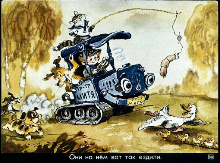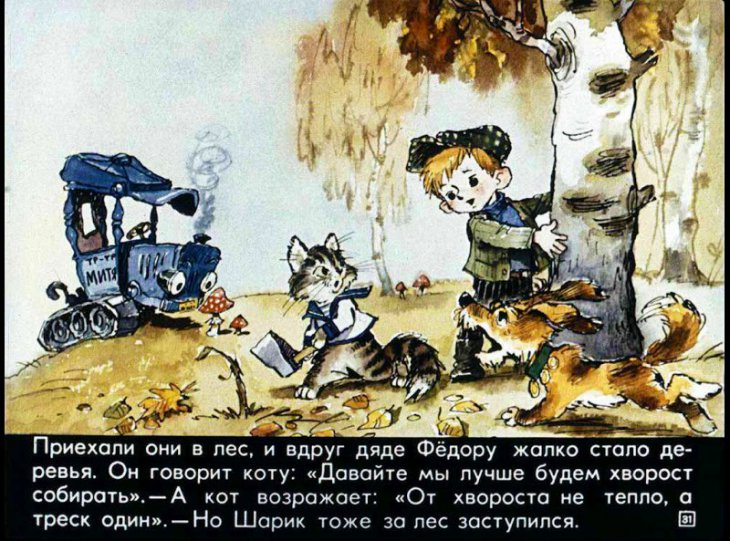 Взял кот деньги и пошел за коровой. А дядя Фёдор на почту пошел письмо писать на завод, чтобы ему трактор выслали.