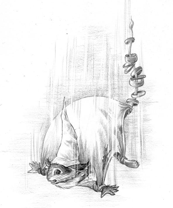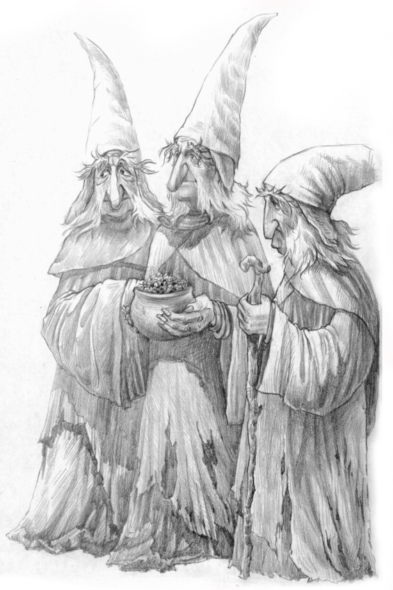 Когда ужин подходил к концу, дверь подвала со скрипом открылась и показались три ночные плаксы. Это были очень старые плаксы. Одеты они были необычно: головы их венчали высокие сиреневые колпаки, украшенные золотыми самородными блестками, плечи покрывали плюшевые плащи, сплошь проеденные молью, на тонкие хвосты были надеты многочисленные опаловые кольца. Это были символы вестников. Йокку был так потрясен этим шествием, что застыл с ложкой у открытого рта. Остальные, включая драконов, вскочили со своих мест, опустились на колено и склонили головы, отдавая, согласно законам Межгорья, дань почтения вестникам.