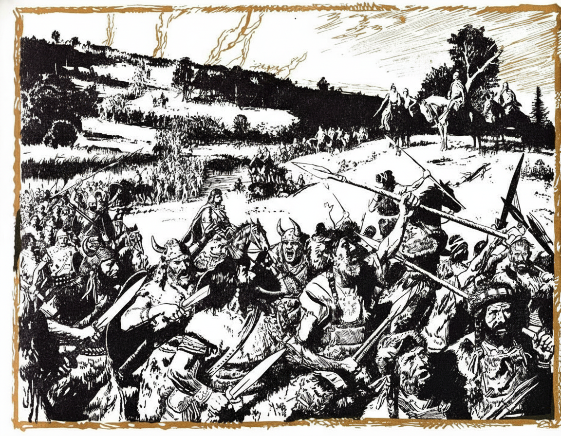 Затем начал он полунапевно-полуговорком свою героическую песнь о великой войне свевов с римлянами в далекой Галлии за Рейном.