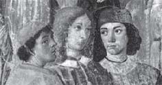 Козимо Россели. Фрагмент фрески с портретами Пико делла Мирандолы, Марсилио Фичино и Анджело Полициано. 1486 г.