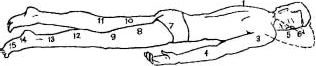 В соответствии с правилами 4 и 5, при выполнении общего массажа (т.е. массажа всех отделов туловища, конечностей и головы массируемого) обычно придерживаются такой последовательности (рис. 4). Вначале массируется дальняя часть спины (выполняются на ней последовательно все массажные приемы), шеи и ближняя рука, после чего массажист переходит на противоположную сторону от массируемого и выполняет эту процедуру на всех тех же участках другой стороны, а затем приступает к массажу дальней ягодицы и ближнего бедра, после чего выполняется второй переход. В той же последовательности массируются противоположные участки ягодиц и бедра, затем на ближней конечности – икроножные мышцы, ахиллово сухожилие и подошва – и выполняется второй переход с массажем тех же участков ближней ноги. После массажа задней половины тела массируемый переворачивается на спину. Массаж начинают с межпальцевых промежутков передней части стопы ближней конечности, голеностопного сустава, передней группы мышц голени, массируют колено, бедро, дальнюю часть груди и массажист вновь переходит на другую сторону, массирует ближнюю ногу, дальнюю часть груди и весь живот.