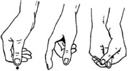 • щипцеобразное разминание, как и соответствующие поглаживание и растирание, выполняют на длинных тонких мышцах и сухожилиях. Прием заключается в том, что мышца захватывается и оттягивается кверху I-м и остальными выпрямленными пальцами и затем разминается между ними;