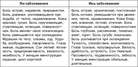 Использование критериев Ян/Инь для диагностики состояния организма. Сочетание определенных внешних и субъективных признаков позволяет определить текущее состояние человека с точки зрения преобладания одного из жизненных начал. Например, таблица симптомов и болевых ощущений Ян– и Инь-заболеваний, предложенная Борсарелло, выглядит так (табл. 4).