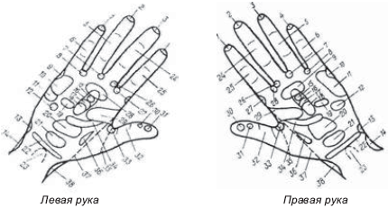 Правая рука: 1, 2, 3, 4 – околоносовые пазухи; 5, 6 – слух; 7, 8 – уши; 9 – суставы верхней конечности; 10 – печень; 11 – желчный пузырь; 12 – аппендикс; 13 – суставы нижней конечности; 14 – яичко, яичник; 15 – солнечное сплетение; 16 – тимус; 17 – надпочечник; 18 – почка; 19 – поджелудочная железа; 20 – кишечник; 21 – мочевой пузырь; 22 – геморроидальные узлы; 23 – пояснично-крестцовая область; 24, 25 – нервная система; 26, 27 – глаза, зрение; 28 – легкое; 29 – желудок; 30 – эпифиз; 31 – гипофиз; 32 – голова, мозг; 33 – глотка, гортань; 34 – ободочная кишка; 35 – шея; 36 – щитовидная железа; 37 – позвоночный столб; 38 – предстательная железа, матка, наружные половые органы.