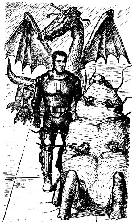 В центральной части одного из куполов сверкали и переливались несколько светящихся шаров, а около них распласталось бесформенной грудой престранное существо с множеством щупалец. Оно не было похоже на осьминога. Кое-где на теле чудовища торчали колючки, но оно не походило и на морского ежа. Покрытое чешуей, зубастое и крылатое, странное существо не имело ни малейшего сходства ни с ящерицей, ни с морской змеей, ни с грифом. Разумеется, описание через отрицание неадекватно и оставляет много неясностей, но, к сожалению, более содержательно рассказать о столь необычном существе не представляется возможным.