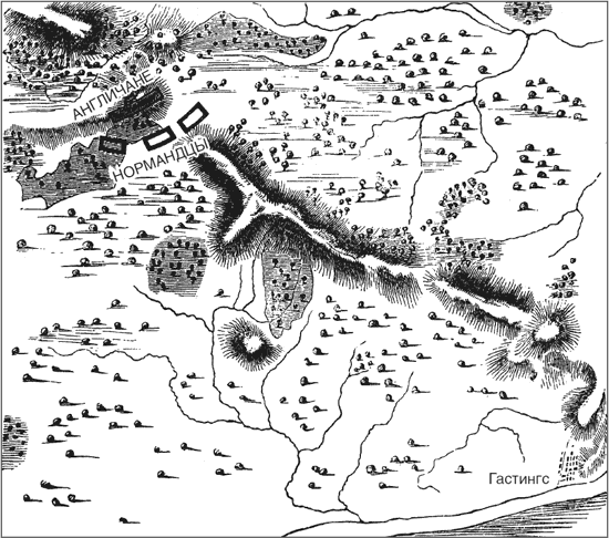 Череда холмов выдается вперед от возвышенности, расположенной к северо-востоку от Гастингса, почти на 12 км. Эта узкая гряда тянется с юго-востока на северо-запад, и вдоль нее, возможно, в те времена, как и сейчас, проходила дорога на Лондон. На некотором расстоянии от Гастингса холмистая местность заканчивается и переходит в долину. По другую сторону этой долины, как раз напротив последнего холма, находится небольшая возвышенность, обращенная на юго-восток, которая называлась холм Сенлак. Именно здесь расположилась армия Гарольда. Атаковать ее в лоб было в тактическом отношении невыгодно для наступающего. Любой маневр грозил ему опасностью удара во фланг, поскольку любое движение у подножия высот прекрасно контролировалось сверху. В тылу оборонявшихся находился труднопроходимый лес, который, казалось, создавал свободу маневра для людей Гарольда и служил серьезным препятствием для противника, в случае если под напором врага саксам пришлось бы отступить со своих позиций. Все говорило о том, что если удастся отразить первый натиск нормандцев, то они вряд ли смогут спастись от решительного поражения. С такими надеждами и ожиданиями (которые были небезосновательны, хотя, как говорится, пути Господни неисповедимы) король саксов приказал водрузить свой штандарт чуть ниже по склону от вершины холма Сенлак, там, где подъем наверх был наименее крутым, и, следовательно, там, где ожидалось нанесение противником основного удара.