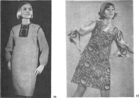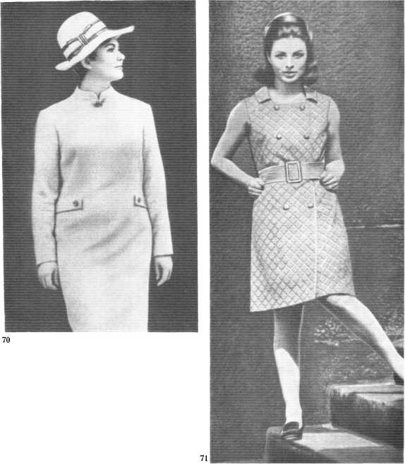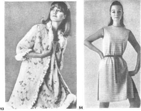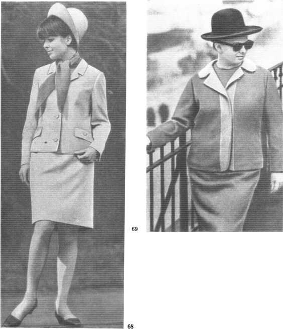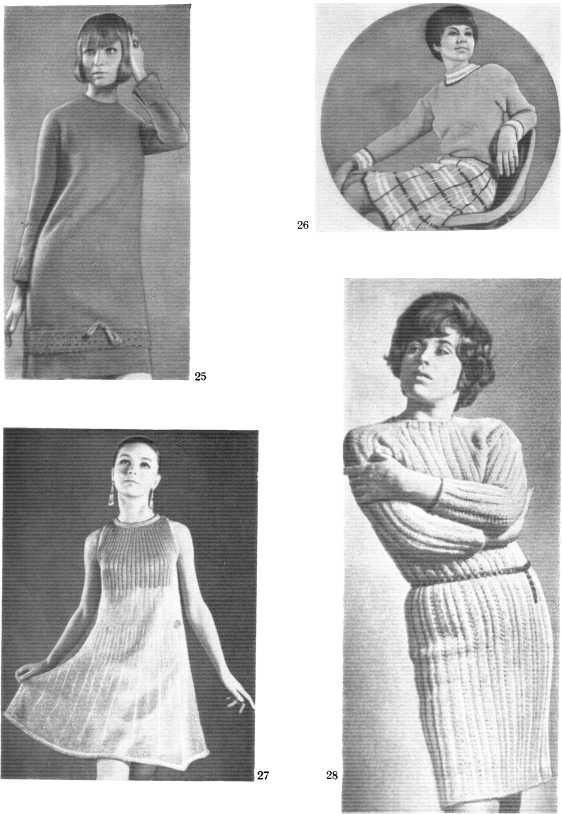В женской трикотажной одежде модны три силуэта: прямой, с прямой линией бокового шва, облегающий бедра; полуприлегающий и прилегающий (характерны для женских и мужских джемперов, рубашек и облегченных свитеров, связанных из легко растяжимых полотен) и расширенный для платьев, костюмов и пальто (илл. 25—29).