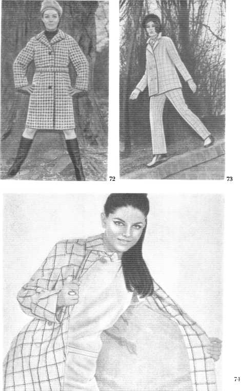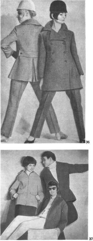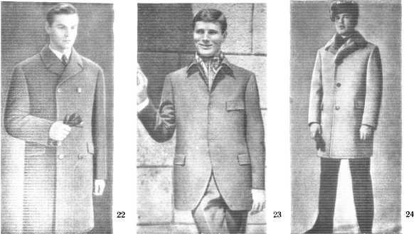 В пальто ведущая форма – «рединготы» с традиционным втачным рукавом. Предлагаются пальто с рукавами реглан из мягких тканей. Для молодежи они делаются спортивного типа или же с отлетной кокеткой. В спортивных пальто широко используются накладные карманы, погончики, пояса, хлястики (илл.19—24).