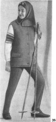 Прежде всего, о любителях лыжного спорта. Для них созданы всевозможные куртки с капюшонами из синтетических дублированных тканей. Изделия простегиваются различными рисунками. К такому костюму лучше всего подходят свитеры и шапочки из шерсти. Можно даже сказать, что они составляют неотъемлемую часть его. Лыжнику-гонщику нужны, конечно, рубашка из шерстяного полотна, брюки из эластичной ткани со штрипками или цельнокроеной пяткой, а вот горнолыжникам требуется комплект из капрона на водонепроницаемой пленке, защищающей спортсмена от ветра. Такой костюм следует утеплять синтетической ваткой. В брюках по боковым швам надо пришивать разъемную «молнию».