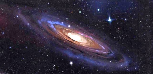 Без телескопа легче всего найти на небе галактику в созвездии Андромеды. Её называют Туманностью Андромеды. Это наша ближайшая галактическая соседка. Луч света, который за секунду преодолевает триста тысяч километров, долетает к нам от Туманности Андромеды за два миллиона триста тысяч лет… Эта галактика очень похожа на нашу, поэтому, глядя на неё, можно представить, как выглядит наша Галактика.
