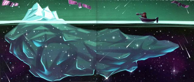 Чтобы помочь тебе представить всё это, мы нарисовали Вселенную в виде ледяной глыбы – айсберга. Подводная его часть – загадочный «океан», а надводная – наблюдаемая астрономами Вселенная, то есть галактики, звёзды, планеты… Вот какой сложной и неожиданной оказалась Вселенная!