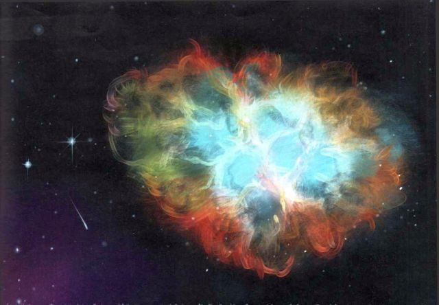 О том, каково будет планетам Солнечной системы, когда Солнце превратится в белого карлика, я расскажу в другой книжке, а сейчас поговорим о судьбе звёзд более тяжёлых, чем Солнце. Что их ждёт в далёком будущем? В конце своей жизни тяжёлая звезда может взорваться, или, как говорят астрономы, вспыхнуть, и на небе появится сверхновая звезда. В результате этого взрыва от звезды останутся очень плотное ядро и удаляющаяся от него оболочка, не похожая на планетарную туманность. Посмотри, например, на фотографию туманности, которую называют Крабовидной.