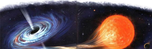 Представим себе, что одна из звёзд этой пары превратилась в чёрную дыру, которая притягивает к себе потоки частиц вещества второй звезды. Оказывается, это вещество не просто падает на чёрную дыру – оно закручивается вокруг чёрной дыры и при этом сильно нагревается.