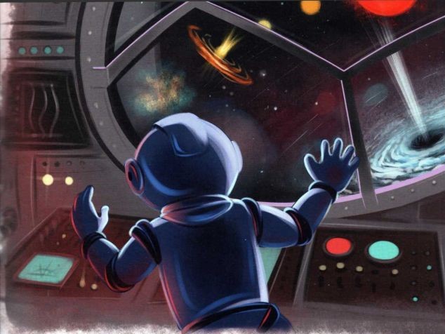 А с космонавтом, оказывается, пока ничего не случилось. Он продолжает приближаться к ужасному месту в центре чёрной дыры и не подозревает, что мы перестали получать сигналы звездолёта. Причём космонавт не только не волнуется, но даже развлекается, глядя в иллюминатор своего космического корабля. Там, почти как в кино, перед ним пронесётся вся история Вселенной. Может быть, он даже увидит Большой Взрыв, после которого появилась наша Вселенная!