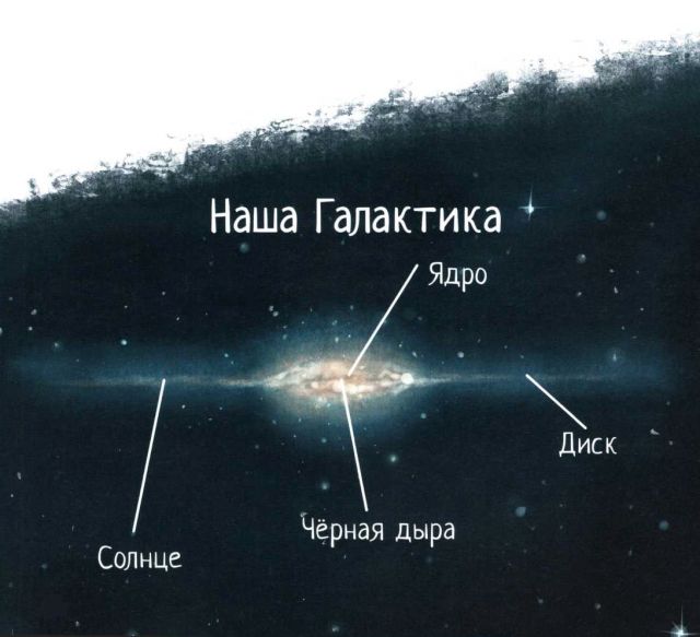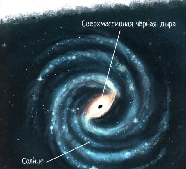 Такие галактики называются активными, потому что в отличие от «нормальных» галактик, например спиральных, активные галактики и их ядра ведут себя очень буйно, светят исключительно ярко. Астрономы обнаруживают их на невероятно больших расстояниях! Сравнивая «портреты» спиральных и активных галактик, ты сразу же обнаружишь, что они не похожи друг на друга. И всё-таки для нас важно не это. Оказалось, громадные чёрные дыры могут находиться в ядрах не только необычных, но и таких «безобидных» галактик как наша собственная Галактика. Астрономы недавно открыли огромную чёрную дыру в центре нашей Галактики! Это открытие кое-кого очень испугало. Но ты, пожалуйста, не пугайся. Громадная чёрная дыра опасна лишь для звёзд, находящихся близко от неё. А нам повезло: Солнце и Солнечная система расположены далеко от центра Галактики и от ужасной чёрной дыры. Расстояние между нами так велико, что луч света может преодолеть его только за тысячи лет.