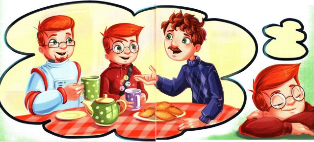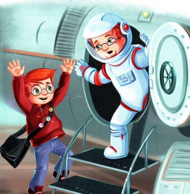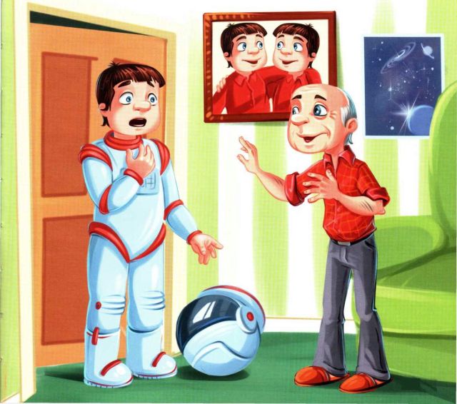Вообрази себе эдакую встречу: космонавт, давно ставший взрослым, беседует с ребёнком, которым он был много лет назад! Мне, как и тебе, наверное, захочется, чтобы при такой встрече наш путешественник подружился и со своим молодым дедушкой, и с самим собой в детстве.