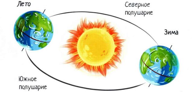 За один год Земля успевает сделать оборот вокруг Солнца. Ось Земли наклонена, и в течение года Солнце по-разному освещает Северное и Южное полушария Земли. Поэтому на Земле происходит смена времён года: лето сменяется осенью, осень – зимой, зима – весной, весна – летом.