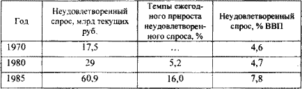 [Закрыть] Госкомстат РФ, оценивавший объем неудовлетворенного спроса, исходил из гипотезы, что эта проблема появляется с 1965 г., до этого объемы спроса и предложения на потребительские товары были в целом сбалансированы. По расчетам, выполненным в этой организации, нарастание диспропорций на потребительском рынке выглядят следующим образом (см. табл. 4.10). То, что с середины 1960-х годов эта проблема становится все более острой, очевидно всем.[277]277