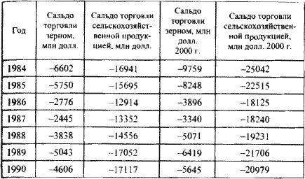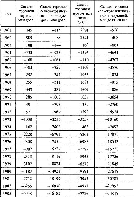 [Закрыть] К началу 1970 г. экспортно-импортные операции сельскохозяйственными продуктами в СССР были еще более или менее сбалансированными. К началу 1980-х годов превышение импорта над экспортом этих товаров составляло более 15 млрд долл.