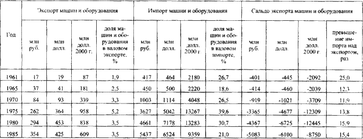 Примечание. Перевод в доллары осуществлялся по официальному курсу Госбанка СССР. Значительная часть (30% в 1985 г.) экспорта машин и оборудования в развитые страны приходилась на Финляндию, торговлю с которой велась по бартеру, а не в обмен на свободно конвертируемую валюту, т. е. на бумажки.