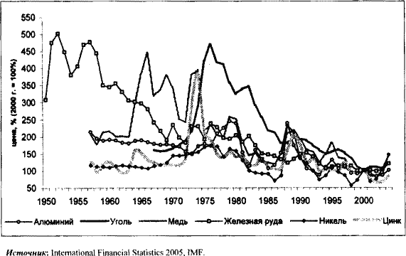 Развитие событий во второй половине XX в. показало, что цены на сырьевые товары по отношению к ценам на продукцию обрабатывающих отраслей действительно снижаются. Но это процесс медленный. Темпы падения цен на сырье в долгосрочной ретроспективе составляли примерно 1% в год. Более серьезная проблема в том, что цены на сырье колеблются в широком и трудно прогнозируемом диапазоне. И при их росте, и при падении такие колебания создают серьезные проблемы как для экспортеров, так и для импортеров.
