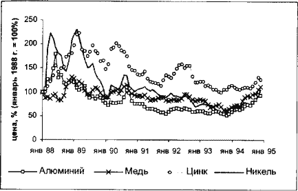 Помесячная динамика текущих цен на цветные металлы на мировом рынке в 1988–1995 гг.