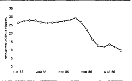 Помесячная динамика текущих цен на нефть на мировом рынке в 1985–1986 гг.