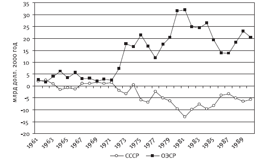 Рис. 4.1. Сальдо торговли зерном СССР и стран – членов Организации экономического сотрудничества и развития (ОЭСР), 1961–1990 гг.