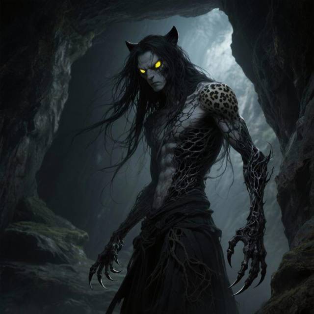 Я резко развернулся, заслонив собой детей. Из глубины пещеры выходила высокая худая фигура. Человек, но не совсем: удлинённые пропорции тела, когти вместо ногтей, длинные чёрные волосы свешивались на лицо неопрятными прядями и, как упоминали дети, глаза, горящие жёлтым светом в темноте. По всему его телу вились чёрные жгуты пульсирующих вен.