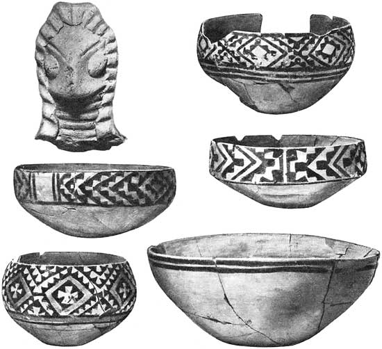 В пору раннего энеолита обычай украшения посуды росписью широко распространен – почти 30 % глиняных сосудов орнаментированы. В росписи господствуют композиции из крупных геометрических элементов, главным образом треугольников. Здесь нет ни дробной пестроты, ни изощренной декоративности. Фигуры козлов линейно-схематические, хотя и переданы уверенными мазками. Изображение непрофильное: художник воспроизводит пару рогов и обе пары ног независимо от того, могут ли они быть видны при данном положении фигуры животного или нет. То же мы видим и в рисунке животного на черепке с Карадепе, хотя залитое краской туловище скорее напоминает профильное изображение. Двумя черточками подчеркнута пара ног. Наоборот, торсы женских статуэток мягко моделированы, с большим реализмом и тонким чувством натуры передан образ полной плодовитой женщины. Хотя по принципу «часть вместо целого» в фигурах второго подтипа раннего энеолита некоторые детали опускаются, общий стиль лепки от этого не меняется. Часть, заменяющая целое, передана не абстрактным символом, а с натуралистичной полновесностью. Хотя проявляется ряд локальных отличий, территориальная обособленность и рост хозяйственной самостоятельности не приводят еще к нарушению культурного единства в той мере, в какой оно прослеживается в памятниках искусства.
