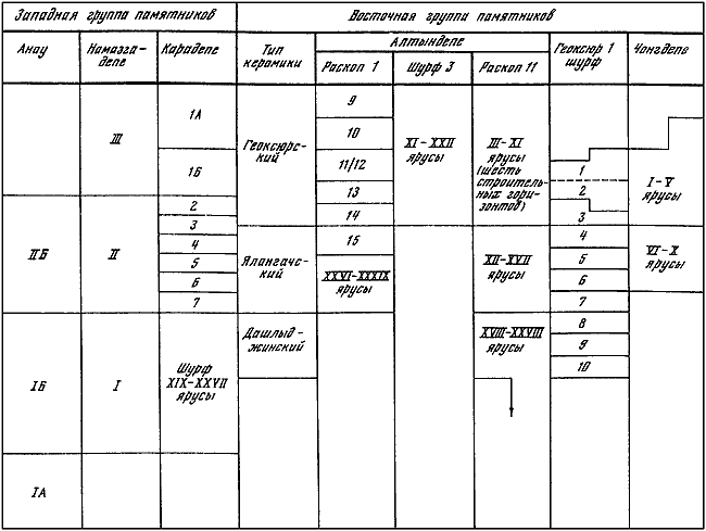 Таблица I. Синхронистическая таблица энеолитических комплексов Средней Азии.