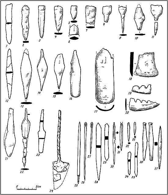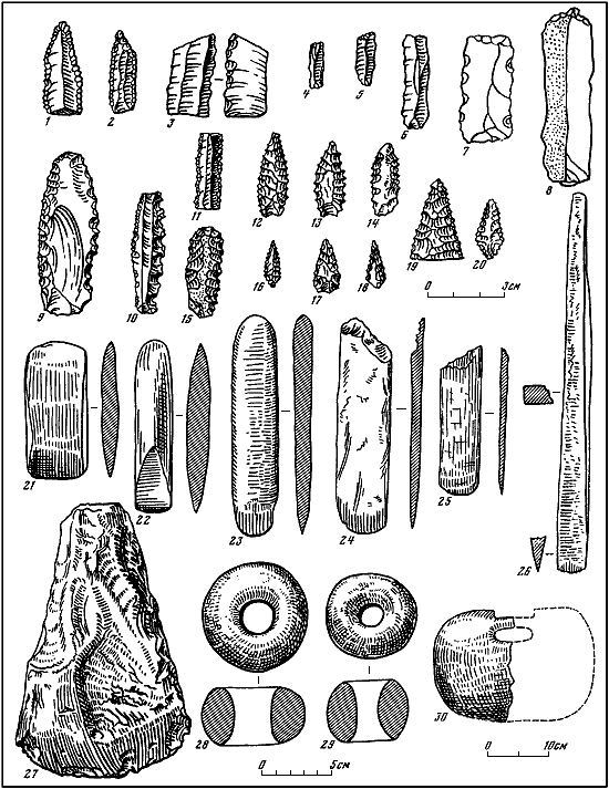 Таблица IX. Кремневые и каменные изделия с энеолитических памятников Средней Азии.