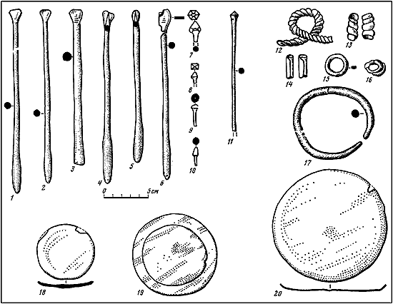 Таблица VIII. Медные украшения и зеркала с памятников энеолита Средней Азии.