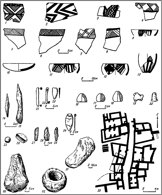 1-13 – керамика; 14–15 – кость; 16–20 – терракота; 21–24 – медь; 25, 26, 30–32 – камень; 27–29 – кремень; 33 – план поселения.