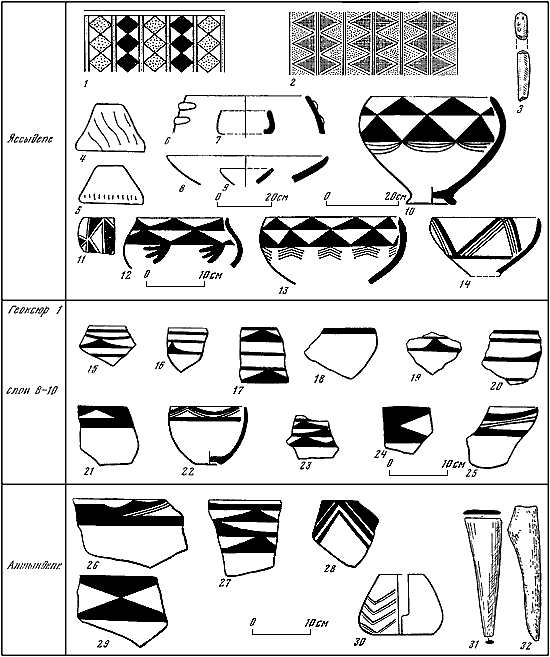 Таблица XII. Раннеэнеолитические комплексы Яссыдепе (1-14), Геоксюра 1 (15–25) и Алтындепе (26–32).