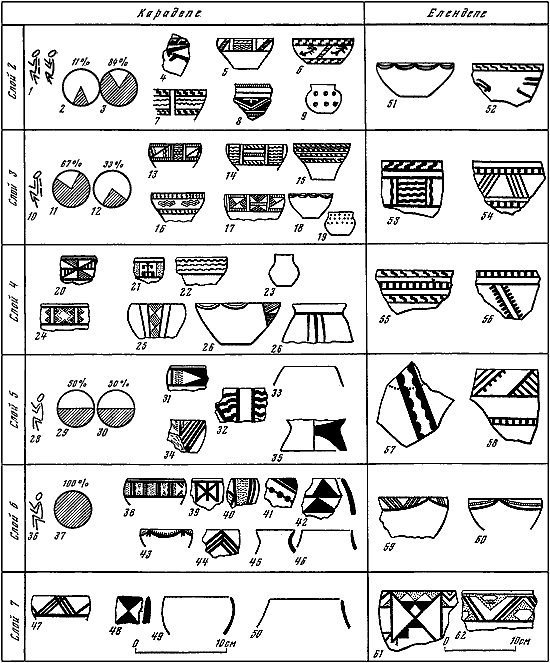 Таблица XIV. Среднеэнеолитические комплексы Карадепе (1-50) и Елендепе (51–62).